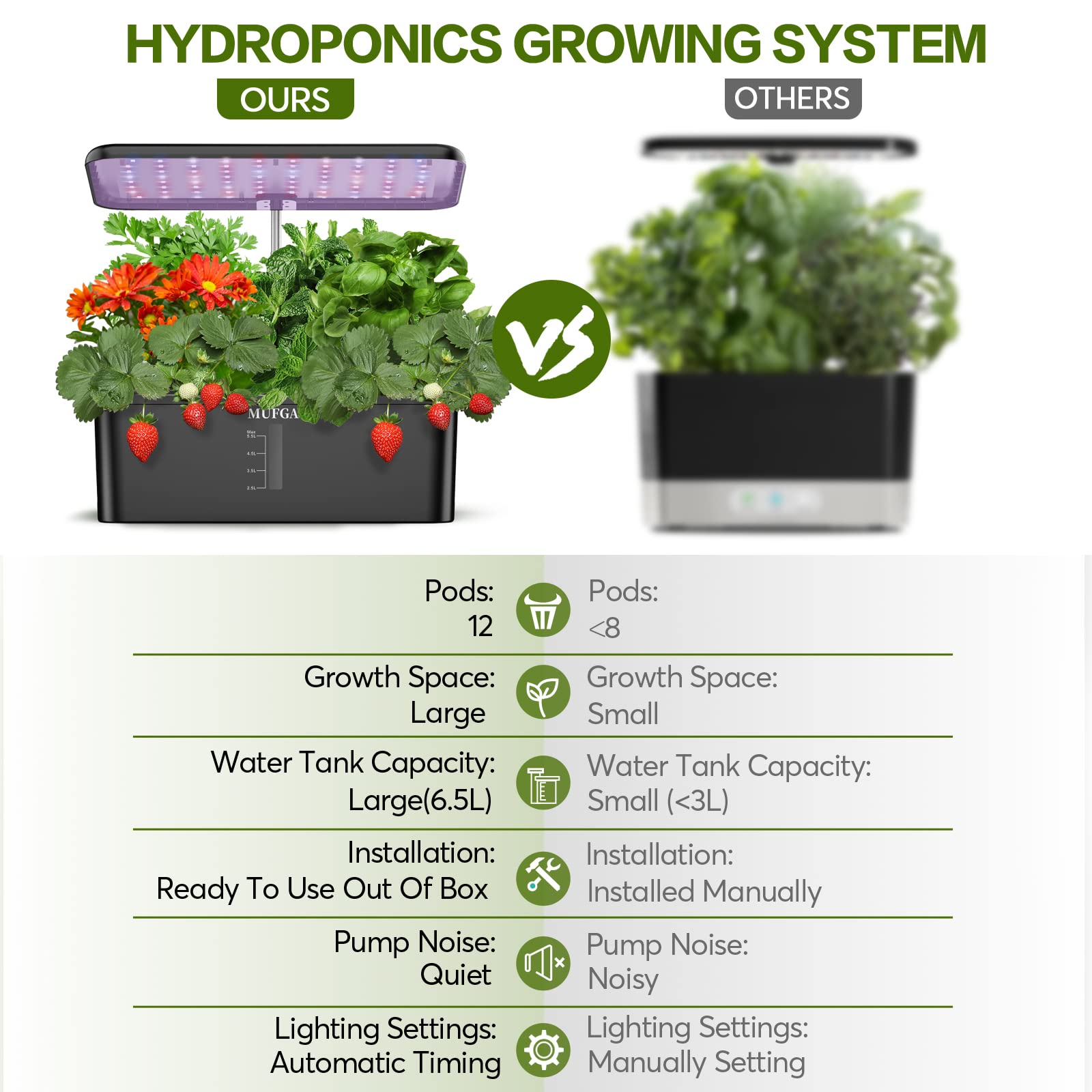 MUFGA 12 Pods Hydroponics Growing System, Indoor Garden with LED Grow Light, Plants Germination Kit, Mini Herb Garden with Pump System, Height Adjustable (No Seed)