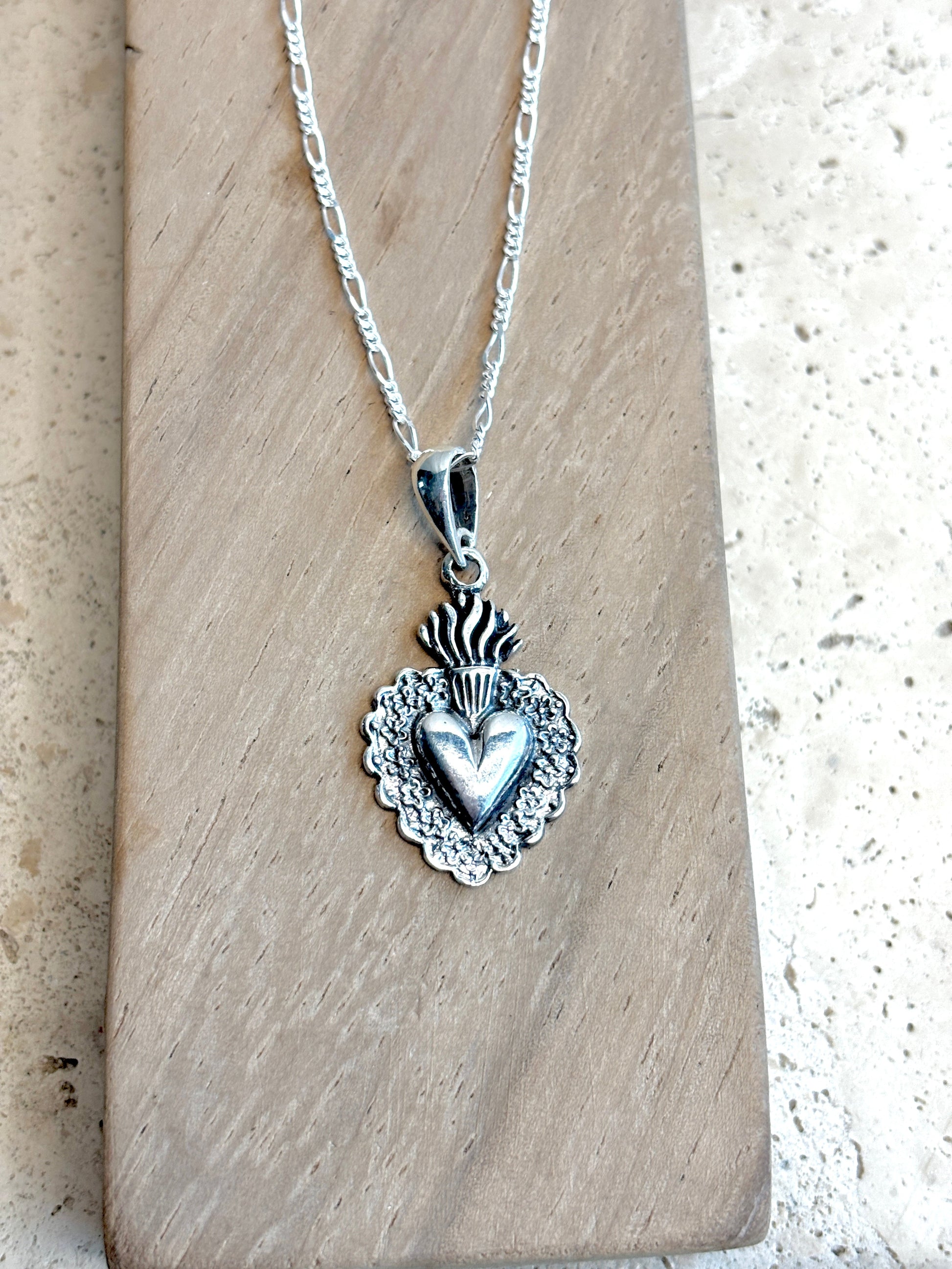 Sacred Heart Necklace in 925 Sterling Silver – Mexican Jewelry with 19” Figaro Chain, Collar de sagrado corazón de plata .925 plata mexicana